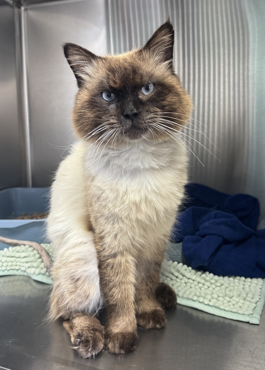 Hello, I'm Milo! Before I came into the shelter I lived the crazy outside life, my silly adventures led to some injuries, so I've been slowly recovering at the shelter getting lots of love and cuddles from the staff and volunteers! The vets went a little wild with the clippers on my tail to check for wounds, so I've got a bit of a rat's tail going on but it'll grow back soft and fluffy in no time! I love to greet everyone with a gentle nudge and a purr; I'm a very affectionate boy who loves a good chin scratch and wouldn't mind curling up on the couch with you! Whether you need a companion for your quiet reading hours or someone to share your secrets with, I'm your man. Due to my previous wild adventures, I'll need to go to a home where I'm kept strictly inside or with access to an enclosed Catio, as I can't help but wander off! But I truly just want a home with endless cuddles and affection please!! If I sound like your guy, then come meet me today!