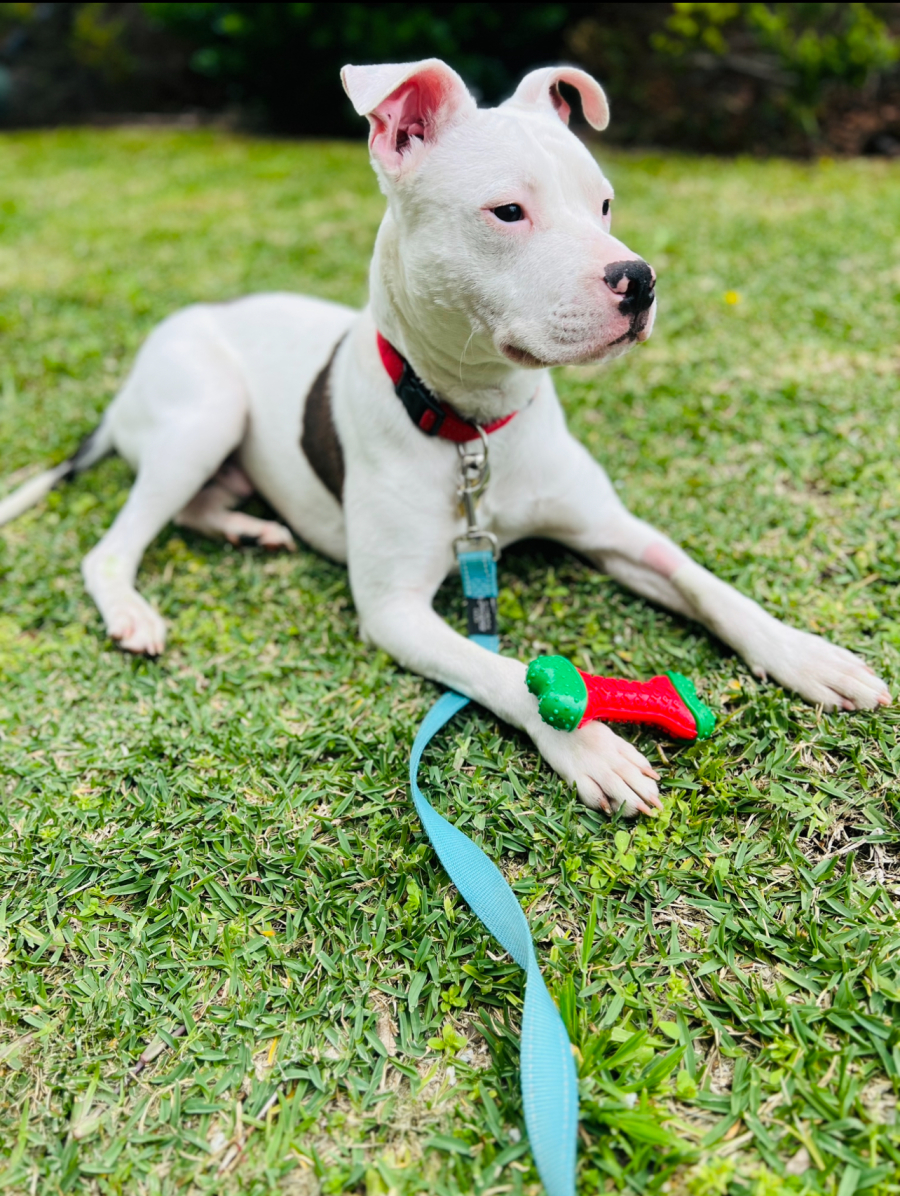 He rocks a white coat and has pink tones around the nose/eye area so will need ongoing sun protection when enjoying nice sunny days.