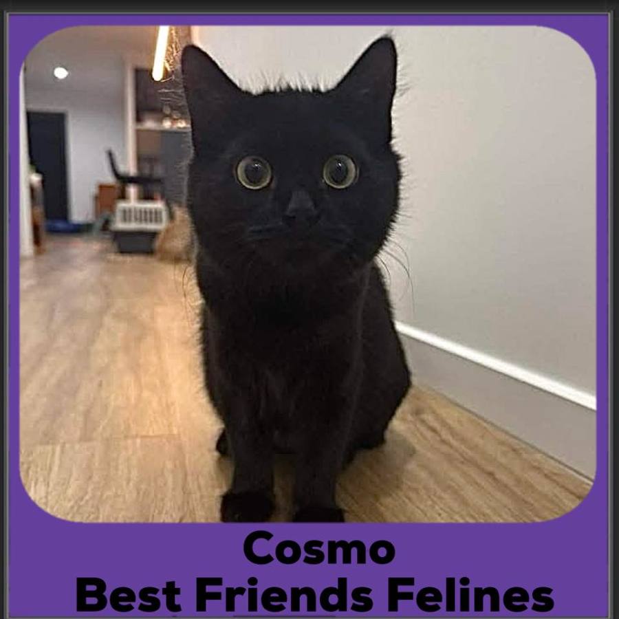Meet Cosmo, a quirky black kitten with big, expressive eyes, adorably stubby legs and a big personality. She's affectionate when she feels like it, playful all the time and obsessed with food. Whether she's chasing toys with wild zoomies or giving you a slow blink from across the room, Cosmo brings a quirky charm to everything she does.