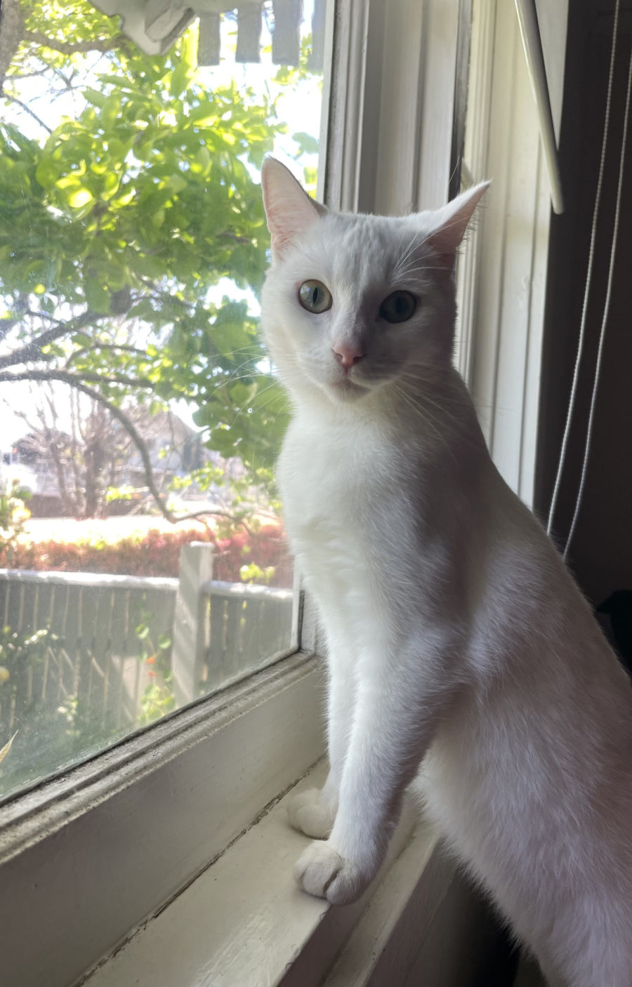 She has mostly passed her playful kitten stage, although she will catch and kill a shoelace or other cat toy on a stick and rarely turns down a well timed play session. Nina likes to climb and explore her environment but overall she is a couch cat, and not too chaotic (in cat terms) as far as knocking things over or getting into trouble. She is a quiet cat with a polite meow, which she uses mainly in excitement at seeing dinner coming and occasionally for greeting.