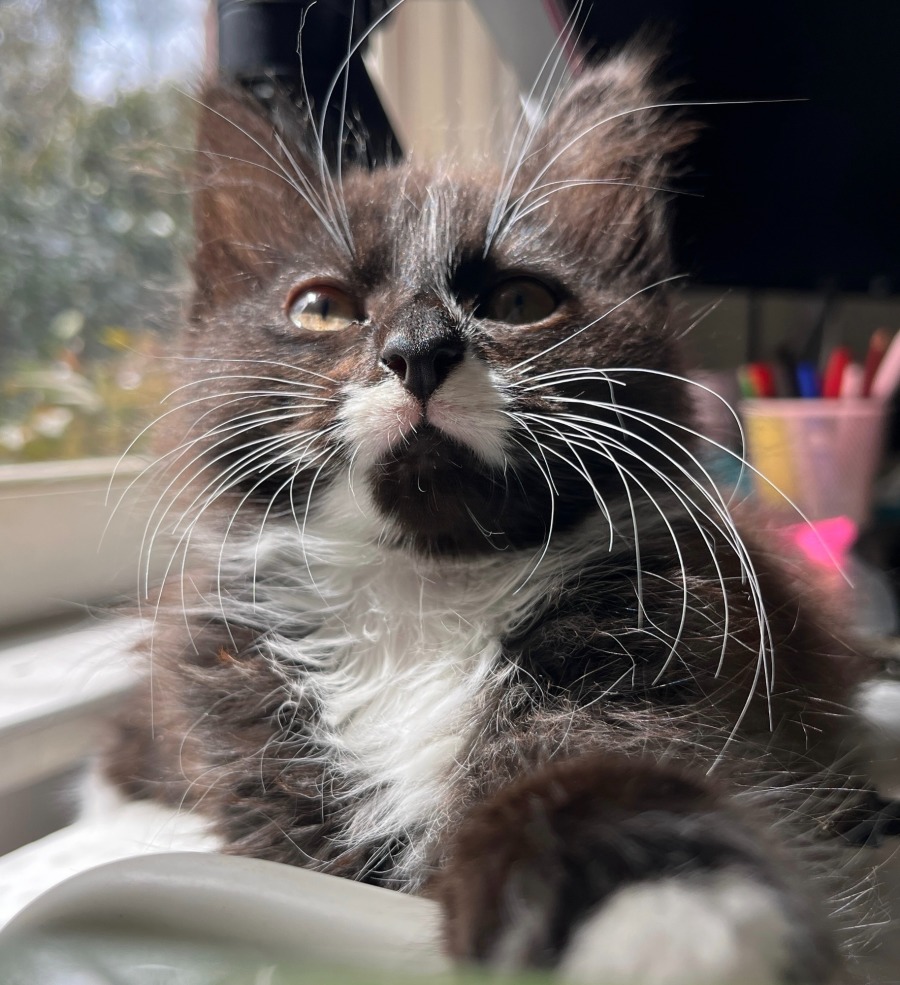 He is a sweet and soulful kitten who operates on his own calm timeline! While his siblings may zoom through the house, Bowser prefers to savour every moment, making him a beautifully calm and gentle companion.
