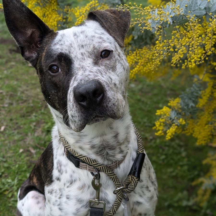 Parker is a boxer x Australian cattle dog, characterized by his boundless energy and affectionate nature. With a strikingly unique appearance—sporting one ear pointed upwards and the other downwards—Parker immediately captures attention wherever he goes. Known for his fun-loving and cheeky personality, Parker is a true enthusiast when it comes to playtime, especially with other dogs who understand his youthful exuberance and are patient as he learns the ropes. His cuddly demeanor makes him a favorite among those who meet him, always eager for affection and a good snuggle. Despite his spirited nature, Parker is still in need of some training, particularly to navigate the world with confidence. He thrives in an environment where adults take the time to guide him through new experiences, reassuring him that the world isn't as intimidating as it may seem. In essence, Parker is a delightful blend of energy, charm, and a unique appearance that sets him apart—a companion ready to bring joy and love to a family willing to give him the guidance and love he deserves. PARKER WOULD SUIT AN ADULT ONLY HOME