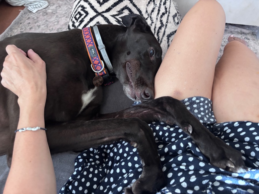 He's very affectionate and absolutely loves a pat and cuddle. Typical chill and easy going greyhound dude.