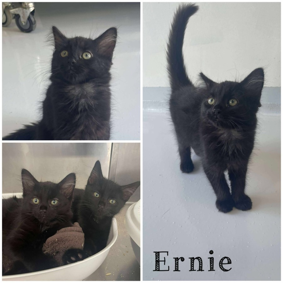 Meet Ernie, an adorable kitten who will steal your heart the moment you lay eyes on him. With his sleek black fur and tiny stature, Ernie embodies all the cuteness a kitten can offer, perfectly packaged with wide, inquisitive eyes full of wonder and a dash of playful mischief.