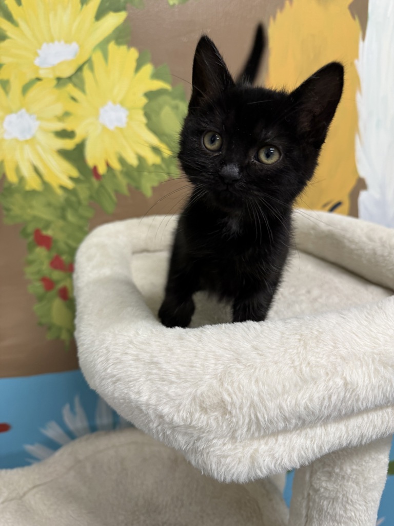 Prue is a sweet and gentle black kitten with a heart full of love and a soft, curious nature. She may look sleek and mysterious, but beneath that shiny coat is the most affectionate little girl who adores pats, playtime, and curling up somewhere cozy for a nap.