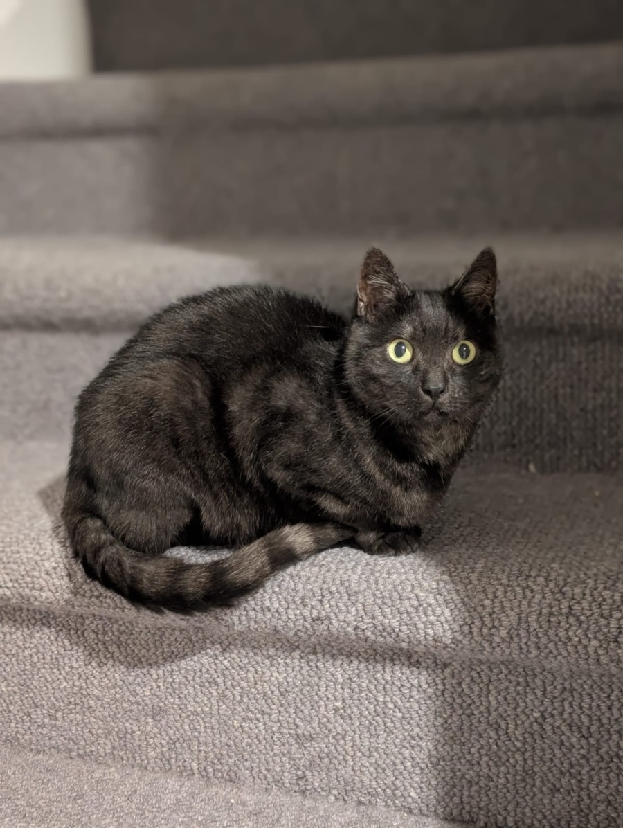 Her foster family describe her as being "shy and awkward but affectionate". She does a cute little head bob when checking things out and is generally quiet but does sometimes let out an adorable little chirp. She likes her pats and ear scratches and apparently has the quirky habit of peeing by sitting on the edge of the litter box and using it like a human toilet haha.