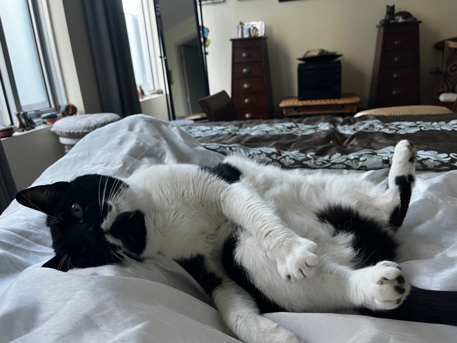 She enjoys being in the same room as her human and is happy to keep you company from a respectful distance, though she’s not a lap cat. You’ll often hear her soft, sweet purr and adorable little squeaky snore when she’s fast asleep.