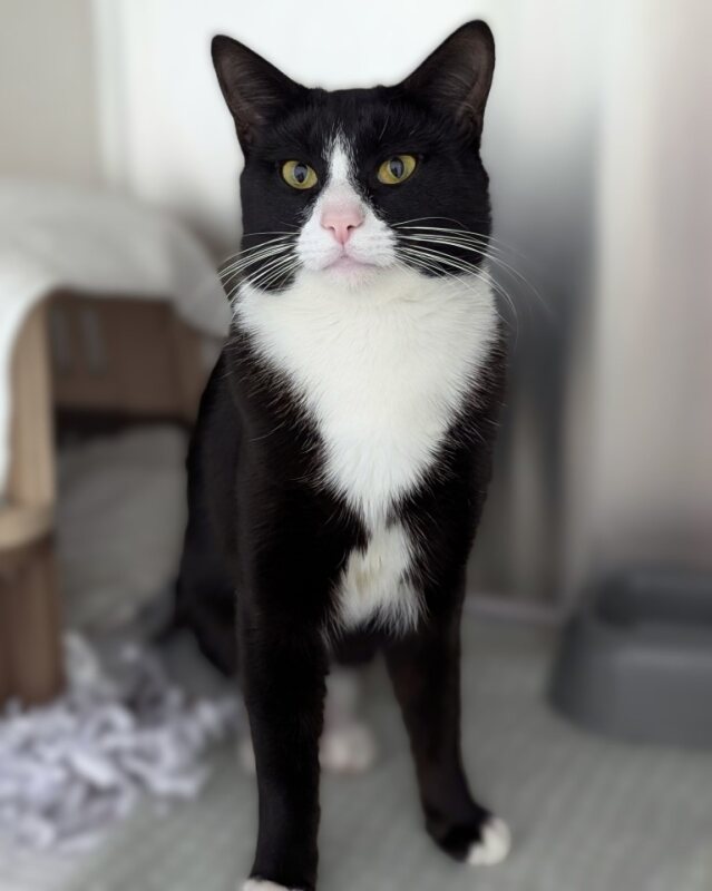 Hi, I’m Penguin. I’m a male Domestic Short Hair, 1 year old. I’m an easygoing, average-energy cat who loves both cuddles and gentle play. I’ll greet you with a soft meow and a purr, then hunt down a sunbeam or a comfy lap to call home. I adore feather wands, puzzle toys, and mild games that keep my curious mind busy. I’m looking for a calm, loving home where I can thrive. I’m good with kids—no known child-related issues—and I’ll happily share a couch or sunny window with the whole family. A routine of daily play, regular meals, and cozy naps helps me stay happy. If you’re seeking a friendly, loyal companion to brighten your days, I could be your guy. I’m ready to settle into a forever home where I’m cherished. Please consider adopting me, Penguin.