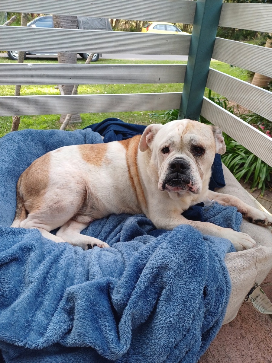 Doza is a magnificent Australian Bull Dog with a heart full of love to give. Despite his 13 years, this dashing gent still carries the spirit of a young pup at heart, often toddling after his humans with boundless enthusiasm. He's resided harmoniously with other dogs (a meet will be needed), isn't fazed by cats, and adores children, making him a well-rounded addition to a family or as a loyal companion to anyone who cherishes canine company. Due to his elderly gait and legs older children and elderly dogs would be best.
