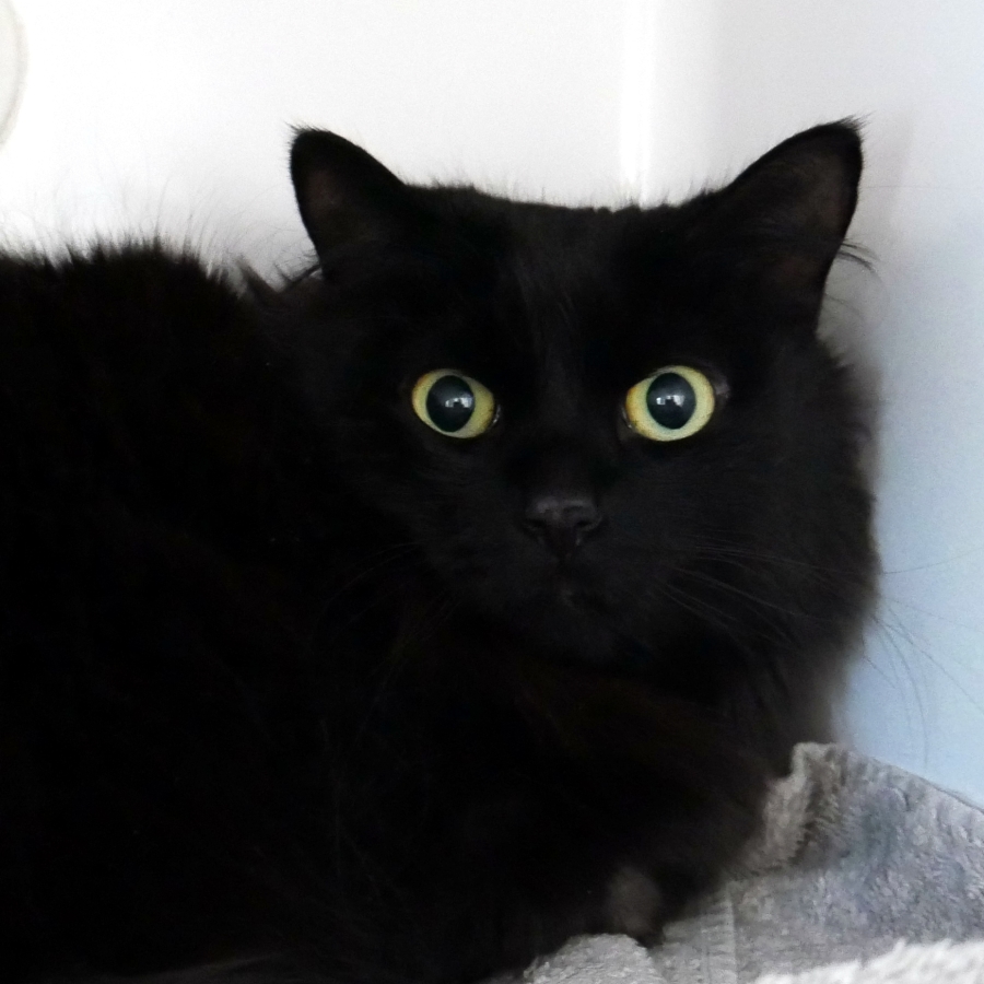 Meet Gia, a stunning black ball of fur with the most captivating eyes. Beneath her striking exterior is a gentle heart that takes a little time to reveal its warmth. Gia is initially nervous around new people and unfamiliar places, but with patience and love, you'll witness her true affectionate nature.