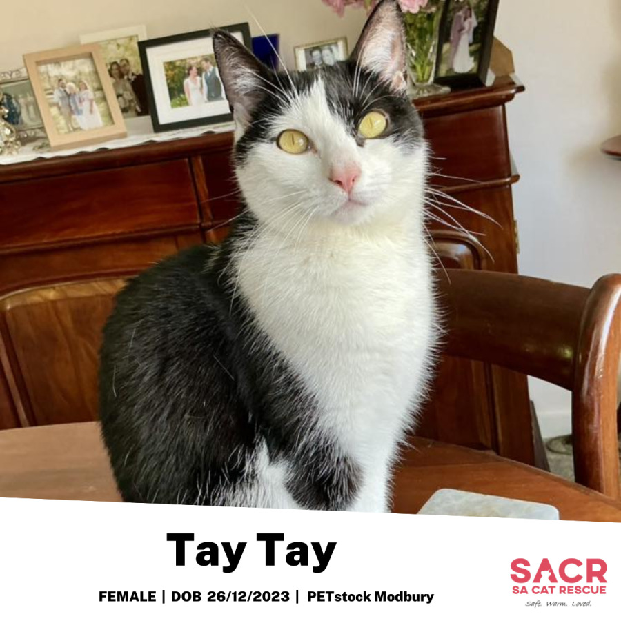 Tay Tay's adoption fee is $75 which includes desexing, microchipping, parasite prevention, and initial F3 vaccination.