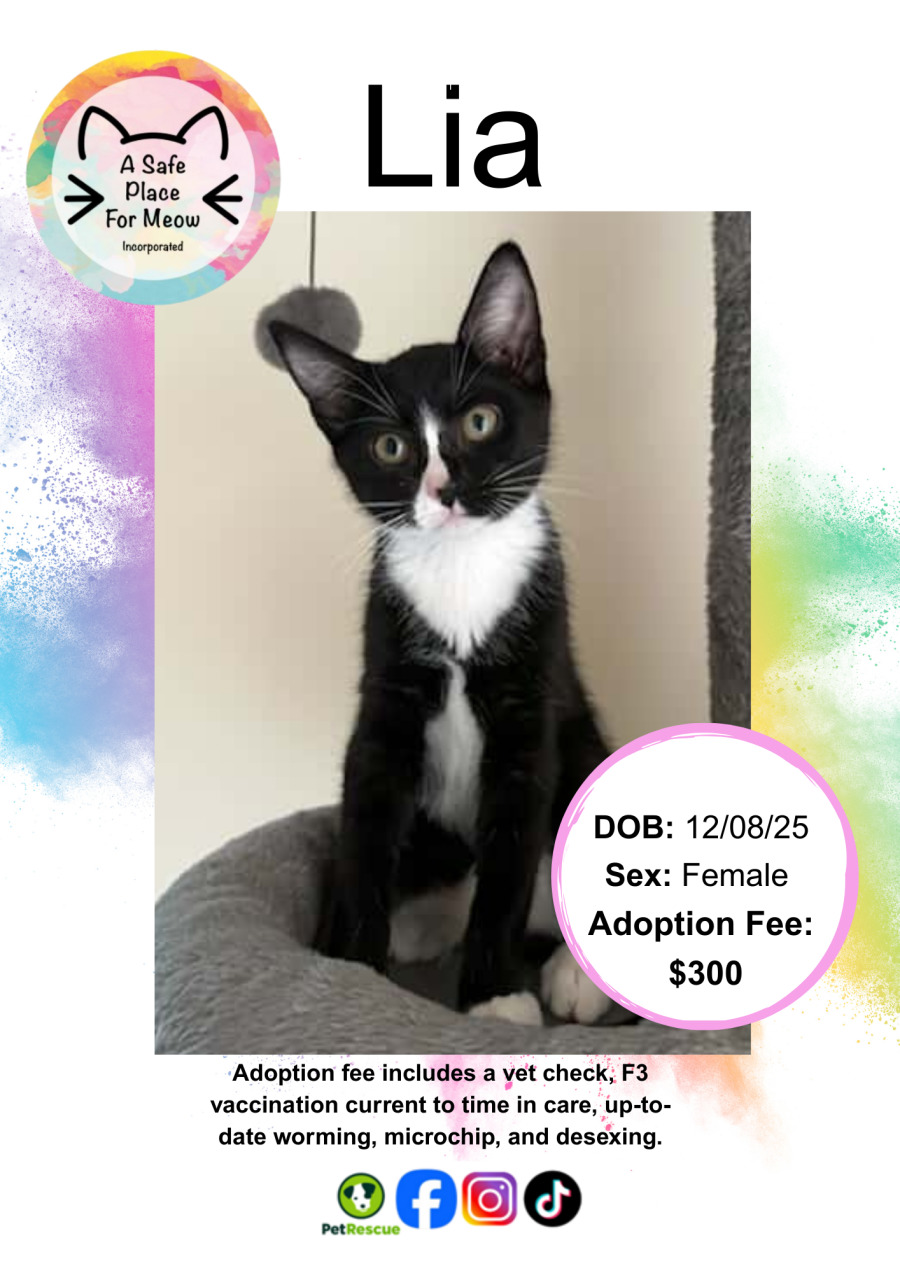 Lia is a petite little lady is full of personality and play! Lia is a confident, curious kitten who loves to chase toys, explore new spaces, and cuddle up once playtime’s over. She’s comfortable being handled and enjoys gentle pats and snuggles.
