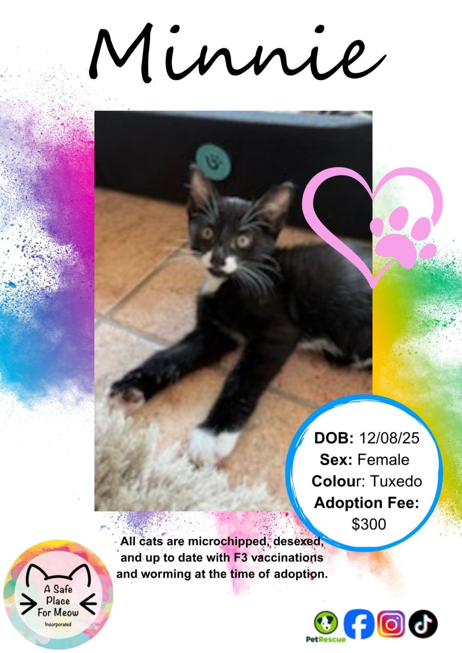 Minnie is the tiniest and sweetest member of her litter — a gentle little soul who’s still finding her confidence. While her siblings race ahead on adventures, Minnie prefers to take things at her own pace, watching the world with curious eyes before joining in.