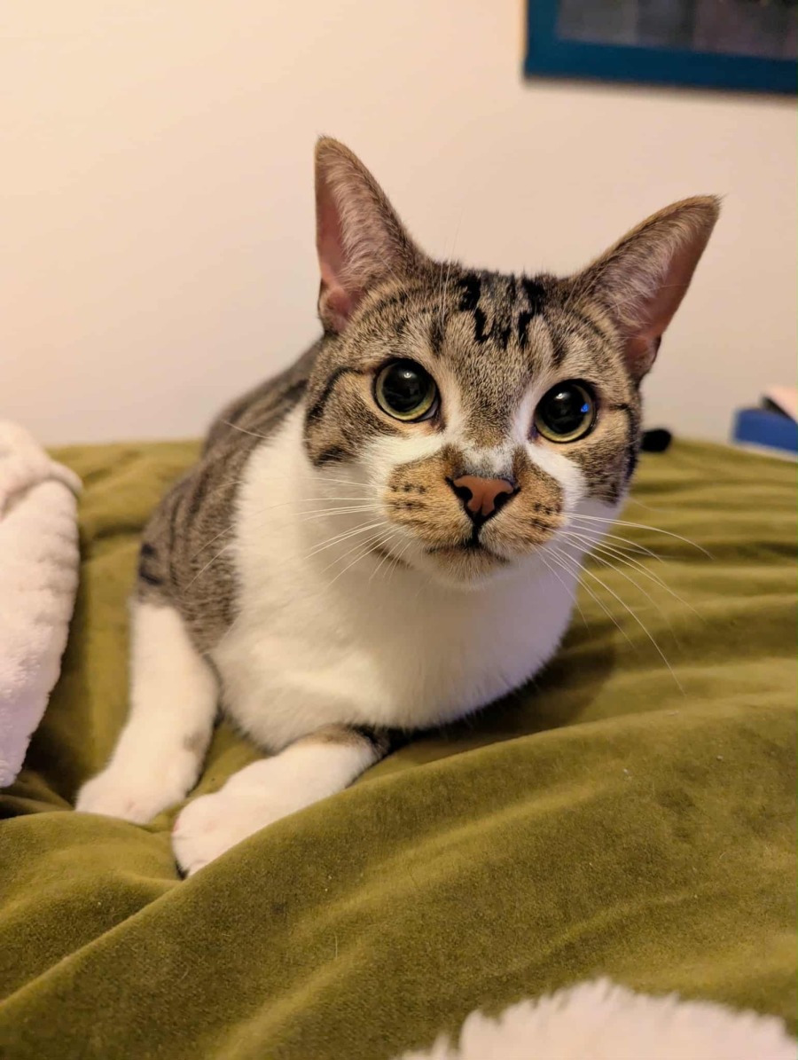 He has a classic cat-like independence but still loves to be near his person, often choosing to sleep right on the bed with you at night. He’s recently been getting better with snuggles, a testament to his growing trust. He is also a champion litterbox user; great with the litterbox is an understatement!