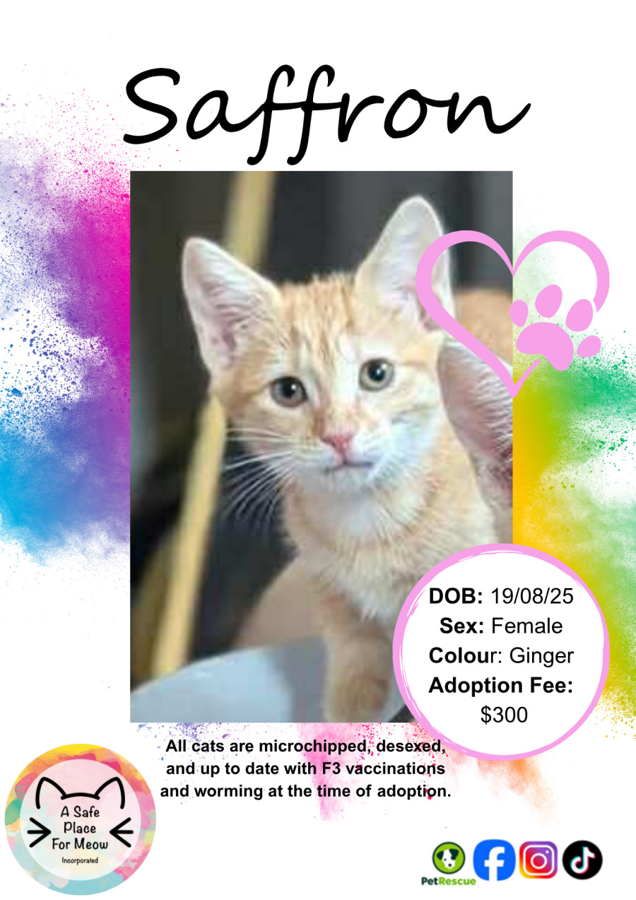 Meet Saffron, a delightful feline companion who is ready to bring warmth and joy into your life. With a sweet and playful personality, Saffron is the kind of cat that makes every day brighter and more enjoyable. Whether it's playtime or snuggle time, Saffron's charming presence is always felt.