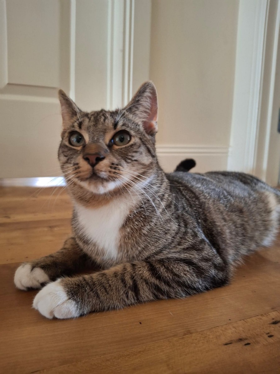 He adores any affection and pats, and would be more than happy to snuggle with you all day. He loves to follow you around keeping you company, especially if you sneak him some chicken while you're cooking! His favourite activity is watching the birds through the windows, particularly if there is a breeze for him to enjoy.
