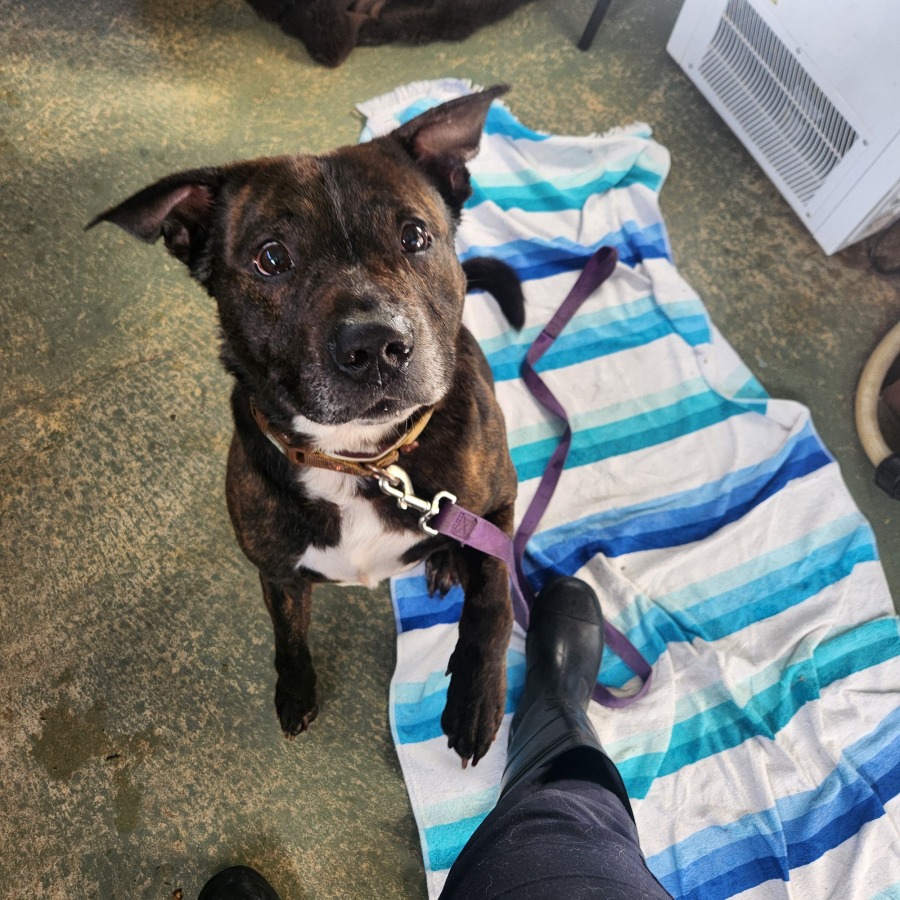 Meet Vinnie, a 7-year-old, 28kg Staffy boy with a gentle soul and an incredible story. You might recognize his name - he was one of 67 dogs surrendered in a widely publicised case. While his past is likely far from ideal, Vinnie is now looking ahead to a future filled with love, comfort, and the care he truly deserves. Vinnie is affectionate, charming, and always ready to melt hearts with his polite begging and habit of propping himself up on chairs like he's part of the team. He's spent time in the office with us, where he's shown he's mostly toilet trained (though he may occasionally mark) and perfectly content simply relaxing near his people. He doesn't ask for much - just a calm environment, gentle companionship, and a soft place to rest. Vinnie has osteoarthritis, so he's searching for a committed adopter who can help manage his ongoing care needs. This includes regular vet visits for Pentosan injections, a healthy diet supported by joint supplements like glucosamine or 4cyte and short, gentle walks to keep him moving without overexertion. Most importantly, he needs to stay warm, cosy, and comfortable. Dog staff are able to go through his ongoing care with his adopters. This sweet boy is best being the only dog in the home due to his medical needs and he's even shown the potential to coexist peacefully with a cat. Vinnie's heart is open, and he's ready to share his love with someone special who can offer him the safety and happiness he's never truly known. If you think you could be that person, please apply today.