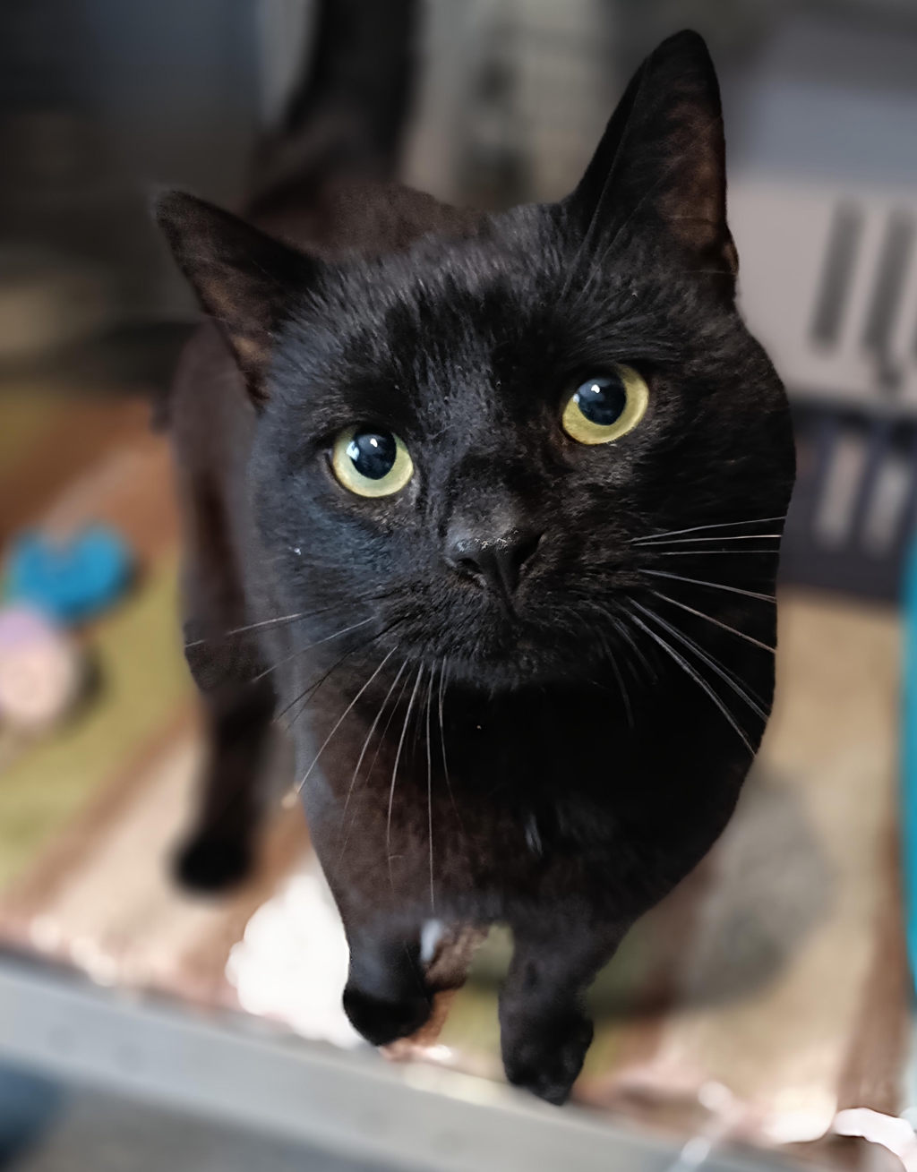 Melvin is a 3-year-old domestic shorthair male with a sleek, glossy black coat. He's affectionate and inquisitive, always curious about his surroundings and people. He can be a touch shy at first and may take a few days to adjust to a new environment. He's lived with other cats and handles multi-cat households well with calm, patient introductions. A tidy, low-drama home suits him best.