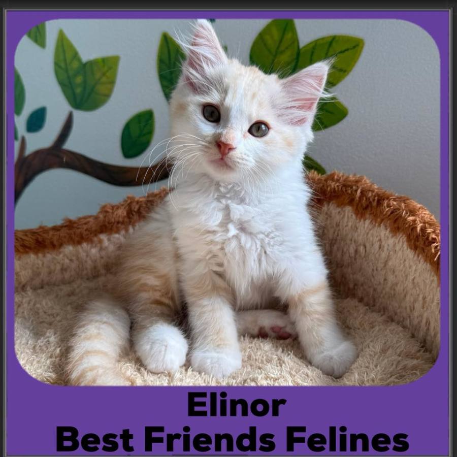 This stunning dilute ginger girl has fur as soft as a cloud and eyes full of quiet curiosity. But don’t be fooled by her pretty face — Elinor is still a very shy girl. She will hide from new people, and sudden movements or loud noises can send her scurrying for cover.
