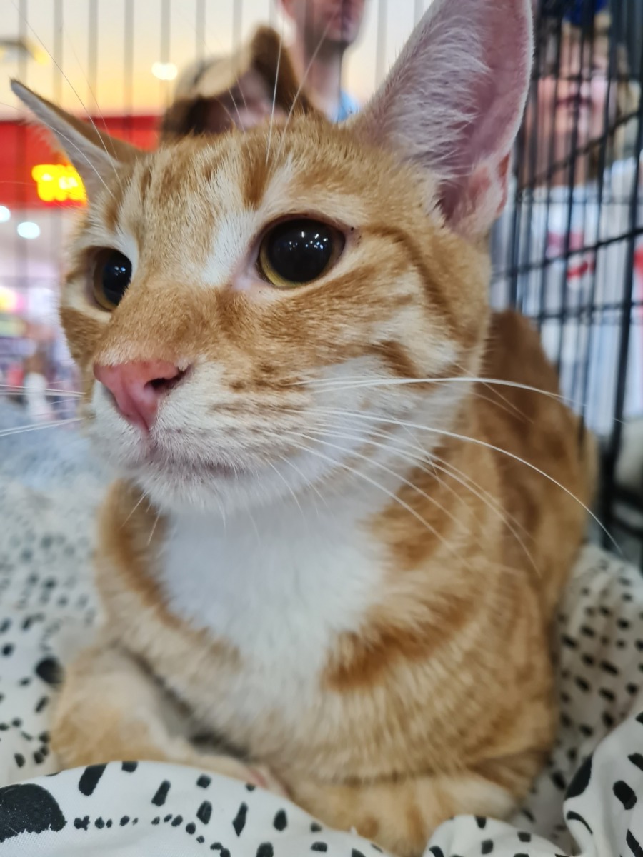 Jonah is a domestic shorthaired ginger cat. He has a beautiful deep orange tabby ginger coat with a white chest.