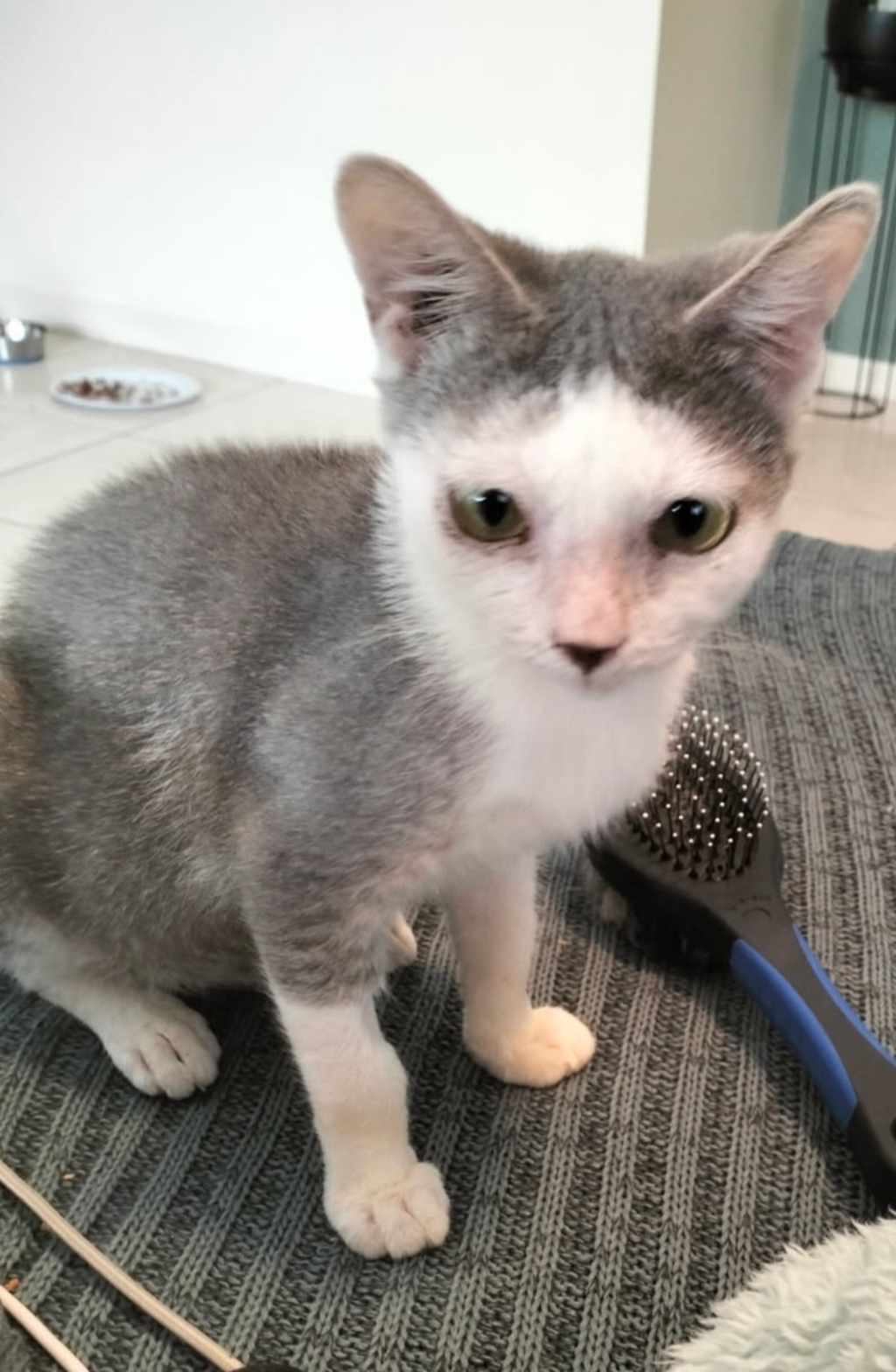 Apollo is a 6-month-old male kitten with a soft heart and a quiet charm. Though shy at first, this sweet boy is learning to trust and open up, one gentle moment at a time. With patience and love, Apollo will blossom into a loyal companion who rewards kindness with quiet affection and soft purrs.