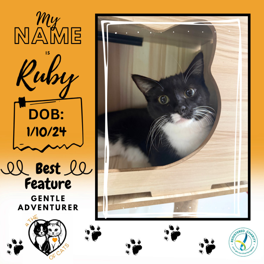 Ruby is clean and gentle and fun seeking. She loves to explore and find cat tower hidden holes. She can often be found peeking out from a tower.