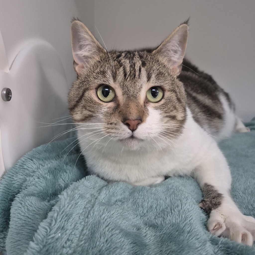 Custard is a big, handsome tabby-and-white boy with an even bigger heart. This affectionate gentleman absolutely adores people and will happily lean in for pats, head bumps, and long cuddle sessions. In fact, he's such a sweetheart that he's become a staff favourite thanks to his smoochy personality and gentle nature.