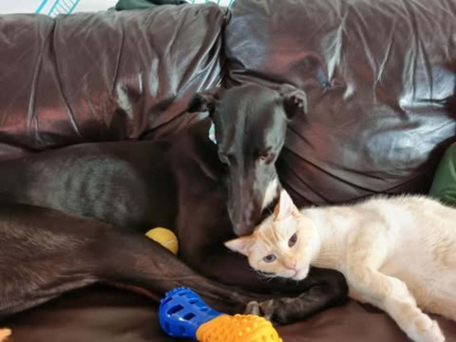 Introducing Fifi, a charming greyhound with a heart full of love and an energy to match. She's an adaptable, sociable girl, always ready to share her warmth with a bustling household. Whether nestled in an apartment with frequent walks or enjoying the freedom of a house with a garden, Fifi finds joy in both living arrangements. She thrives on companionship, delighting in the presence of other dogs and even sharing a gentle rapport with her feline foster brother, with whom she loves to snuggle and groom.