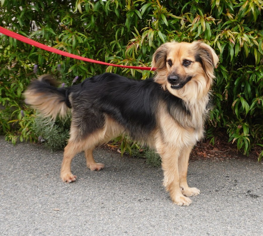 Huxley is a Small Mixed Breed. Based on his size and his appearance: medium-length coat, fluffy tail, expressive ears, and refined features — he may be a mix of a Tibetan Spaniel or Shetland Sheepdog potentially crossed with something else small like a Cavalier King Charles Spaniel or Papillon. (Credit: Chat GPT!)