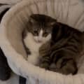He's incredibly affectionate and loves to be held and cuddled. He will try to climb on on your shoulder or chest any chance he gets and will not stop until he gets what he wants! On the flip side, once he has what he needs will go off and sleep somewhere else in the house. He needs the connection but is also fine with some chill time. He's different to other cats as he tends to sit draped OVER your shoulder!