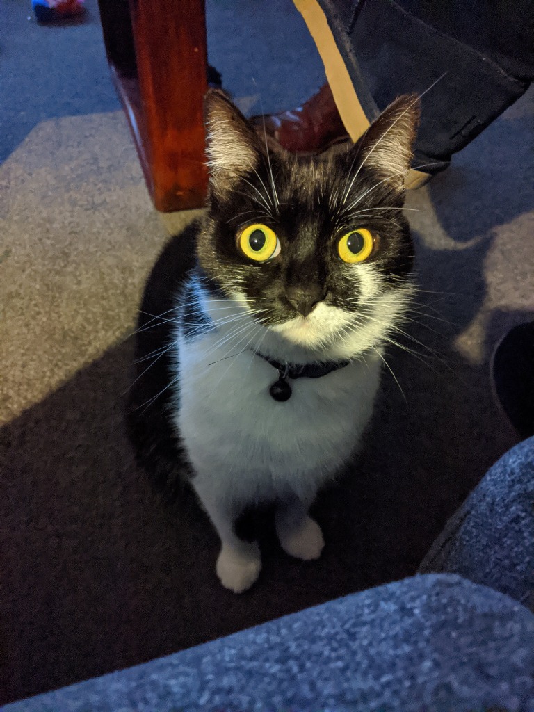 Indie is a black-and-white short-haired beauty who carries herself with queenly confidence and midlife grace. She’s affectionate, clever, and knows exactly what she wants. She’s happiest when she’s near her human — preferably on your lap or perched on your shoulders, purring into your ear and headbutting you to show her love. Indie loves to groom your hair, nap in sunny spots, and supervise from a high perch. She has a healthy appetite and will gleefully help herself to your dinner if you’re not watching!