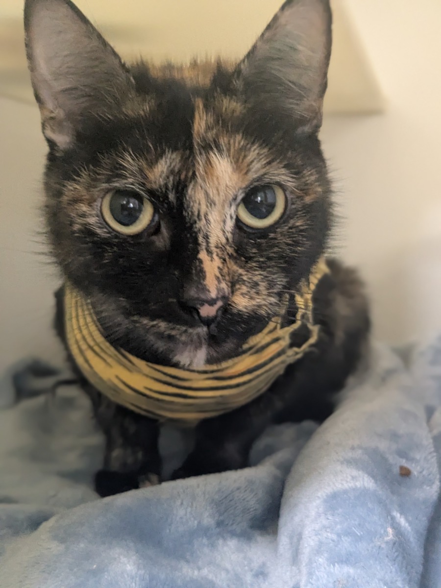 Feather Duster is an inquisitive and engaging cat who enjoys exploring her surroundings and keeping an eye on everything happening around her. She has a curious, observant nature and likes to be part of whatever her humans are doing.