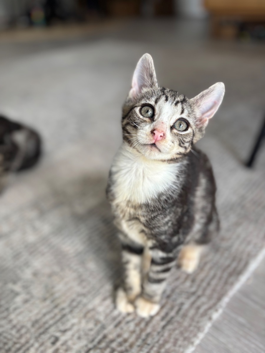 Meet Possum, a charming 12-week-old male tabby and white domestic short hair kitten with an irresistible personality. Named for his adorable pink nose that resembles that of a possum, he is the most outgoing and confident member of his litter. This little bundle of joy has an affectionate demeanor and a heart full of love to share.