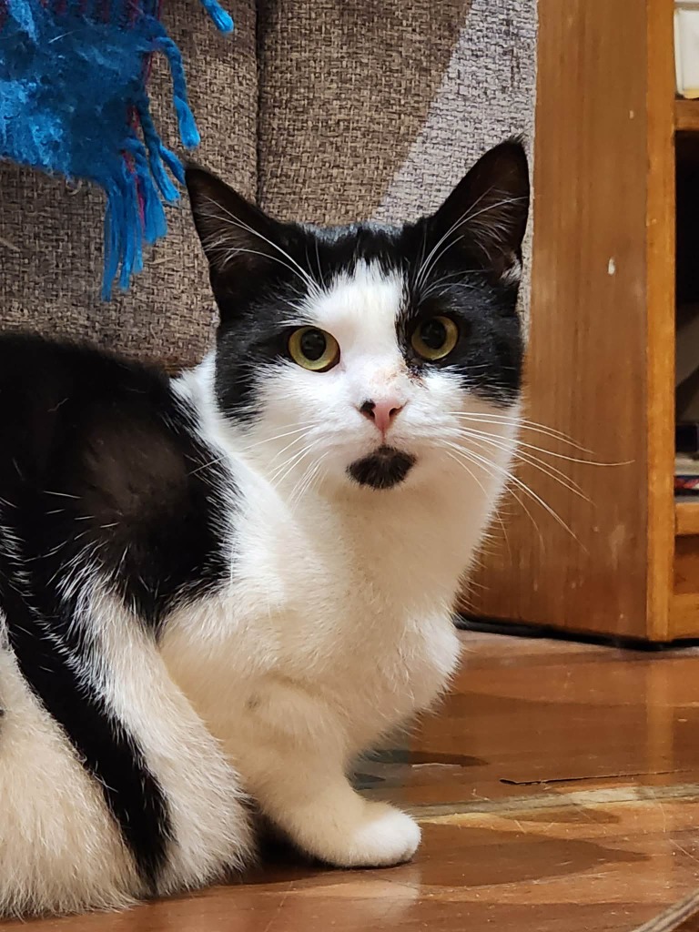 Currently in foster care with her brother Melvin and some other animals (including an Irish Wolfhound!), Momo gets along well with other cats and, with the right introduction, could do fine with respectful dogs too.