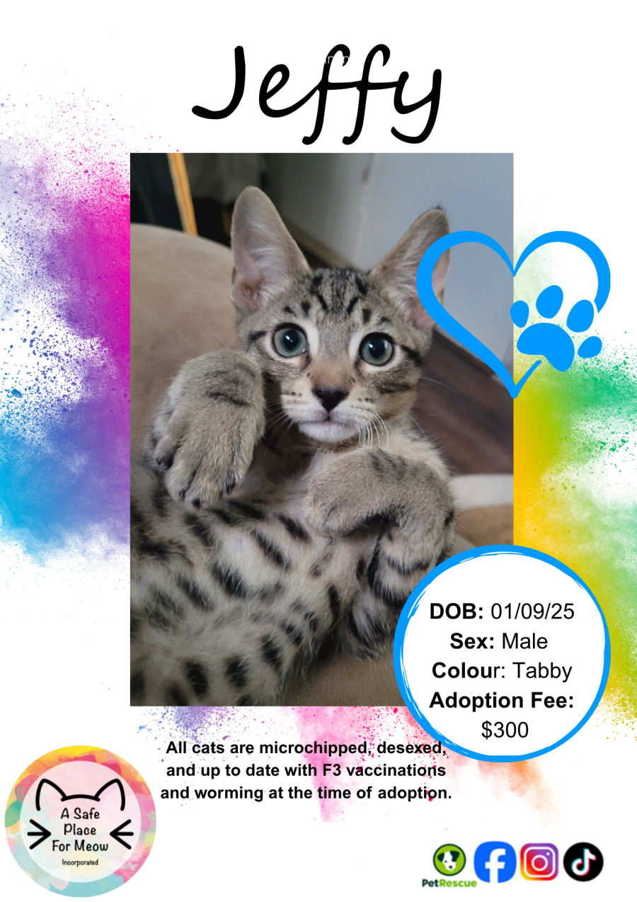 Meet Jeffy, the chatty little perfect poser who is sure to steal your heart. With his charming personality and delightful vocalizations, this striking feline is always ready for a conversation or a cozy snuggle.