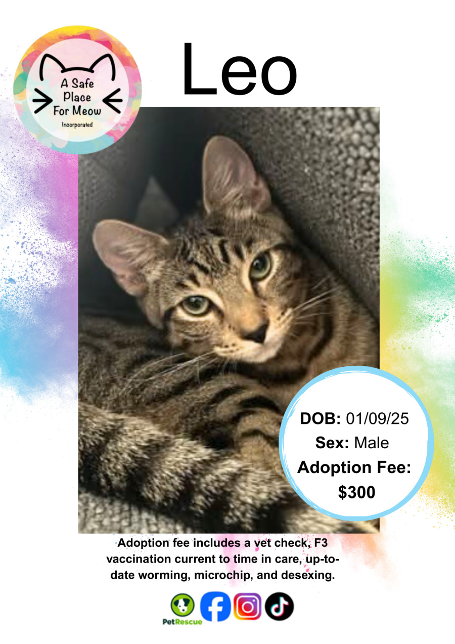 Our adoption fee helps us give every cat the best start in their new life. It covers their initial health check, microchip, desexing, up-to-date F3 vaccinations, and up-to-date worming.