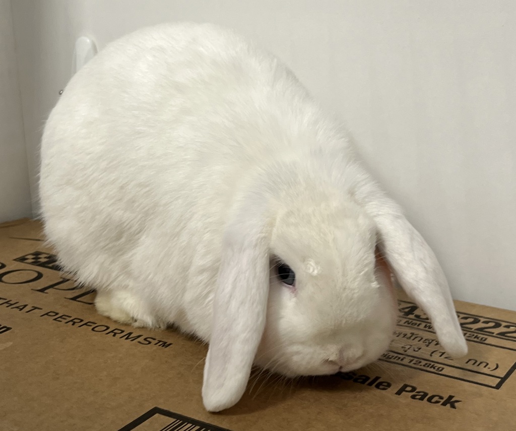 Meet this gentle white bunny with a heart as soft as his fur! He's a calm, affectionate boy who loves to stretch out and doze the day away after a good meal of fresh green veggies.