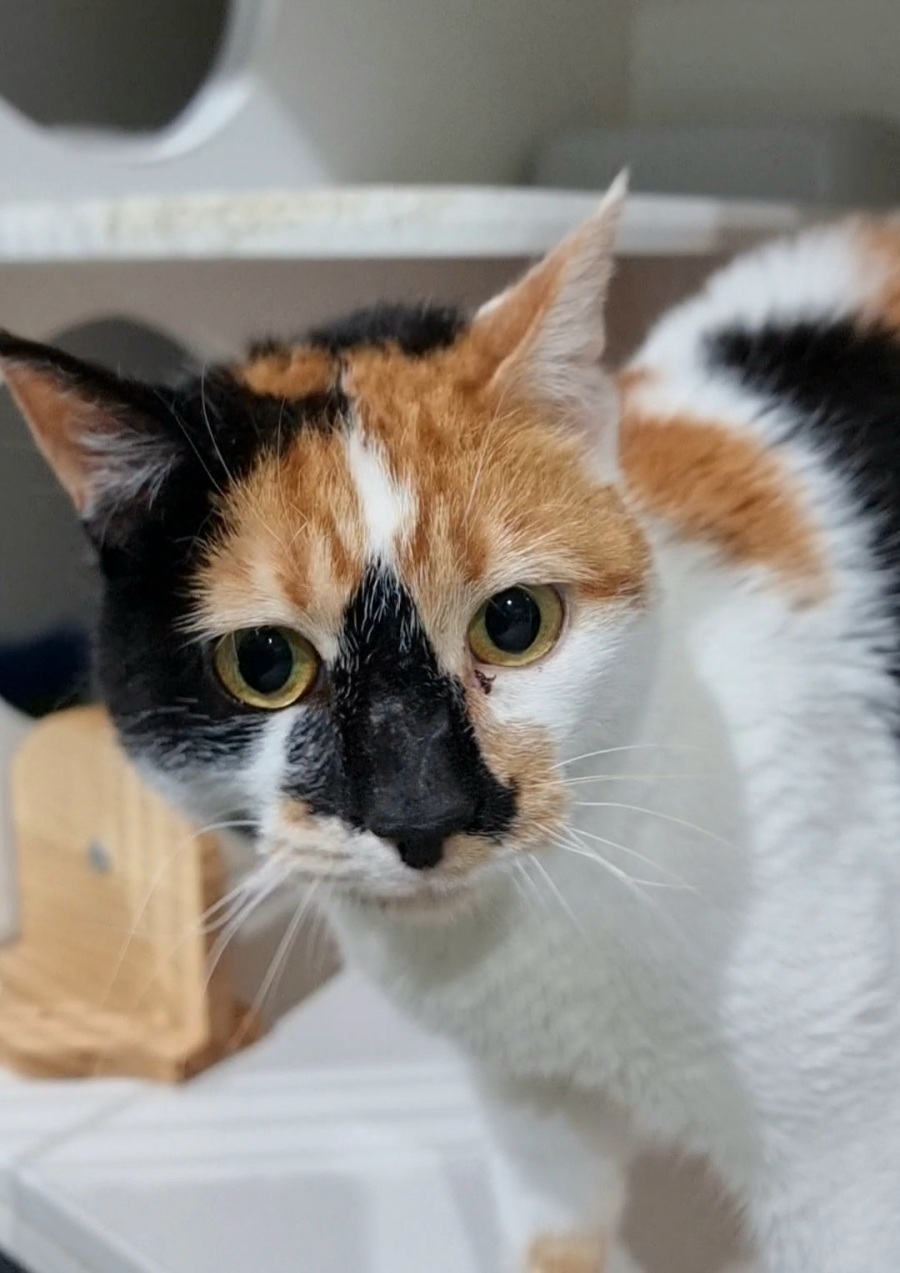 Gloria is affectionate and people-focused, but she can also get overstimulated. She’s the type to thoroughly enjoy pats… right up until she doesn’t. When she’s had enough, she may give a quick bap to let you know. (This is not unusual for torbie girls — they know they’re beautiful and they know their rights.)