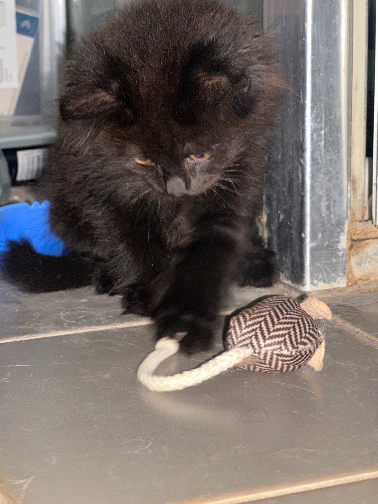 Cinder may have started out as a little stray, but she’s quickly shown that she’s more than ready for a loving home. She’s already mastered the kitty litter like a champ and loves to play with her toys, whether it's chasing them across the room or batting them around with her little paws. Despite her early days as a stray, she’s turned into a playful, affectionate kitten who’s enjoying every moment of her newfound comfort.
