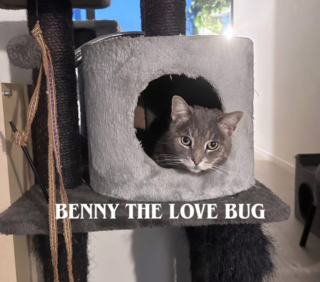 This handsome seven-year-old domestic short hair has the silvery-grey coat of a cloud and the personality of an old soul. Small but strong, Benny is agile and graceful, often perched on a high spot where he can quietly observe the world. He’s a thinker — calm, aware, and deeply attuned to the people around him. He’s affectionate on his terms, a cuddly lap companion by night and a peaceful presence by day.