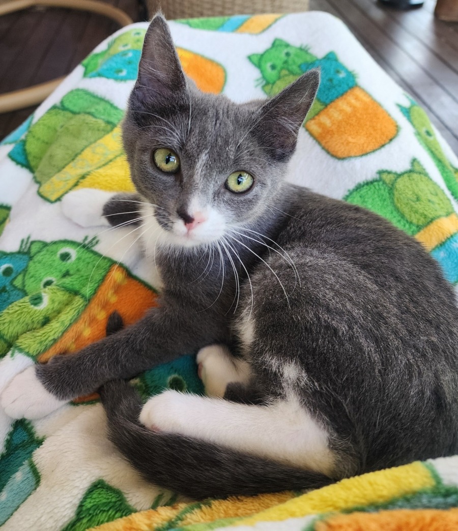 I’m cautious when meeting other cats at first, preferring to watch and see how they act before joining in. If they’re calm, I’ll give a few curious chirps and follow them around. If they hiss, I’ll run away — but never to fight, just to keep the peace. I’ve made friends with my foster buddy Winton, even though he’s twice my size! He can be a bit much, but I mostly just roll my eyes (in a very ladylike way) and keep playing.
