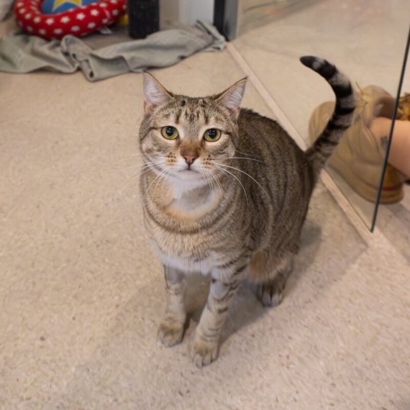 Don’t let her name fool you, Mighty Mouse is a sweet and sociable girl with a big personality and even bigger heart! She’s outgoing, affectionate, and loves spending time with people, but like many confident cats, she can become a little over aroused if handled too much. Once you learn her boundaries, she’s a wonderful companion who will happily seek out affection on her own terms.