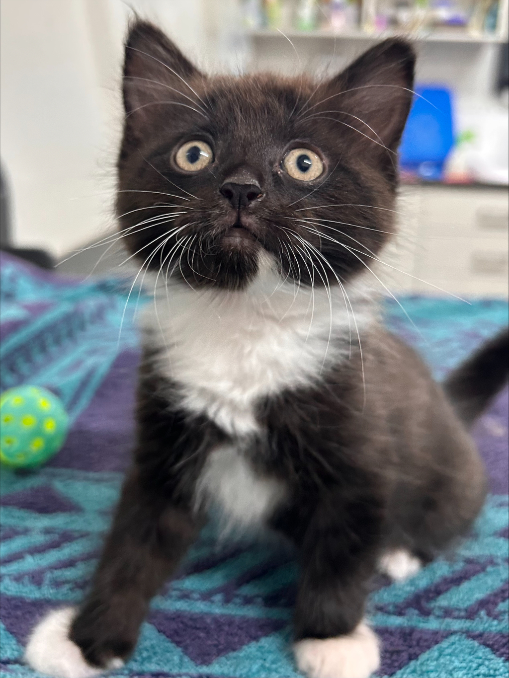 It is ironic to be called a dinosaur when I am a fluffy ball of cuteness, but there you have it! My litter mates and I were strays and we came to the RSPCA and went into foster care. I was the longer haired kitten out of the three of us so there is some special breed in my heritage but no one knows officially what that is, but I am a gorgeous and very easy to handle. I am a sweet Tuxedo kitten that loves cuddles and will spend a long time beside you on the couch getting stroked and purring very loudly. I love people, like older cats and have no fear of small dogs, so I should fit in well to any home with existing pets. Please come in and consider making me a member of your family.