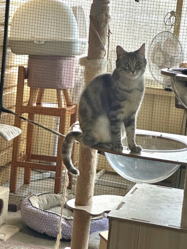 She’s gentle, affectionate, and wonderfully playful. Whether she’s zooming around with her feline friends, scaling scratching towers like a fluffy mountain lion 🐯, or swatting toys with her signature graceful pounce, Smudge always finds a way to make her carers smile.