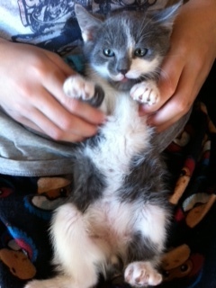 Hi my name is squeekers and i am an 8 week old grey and white male kitten looking for my forever home!