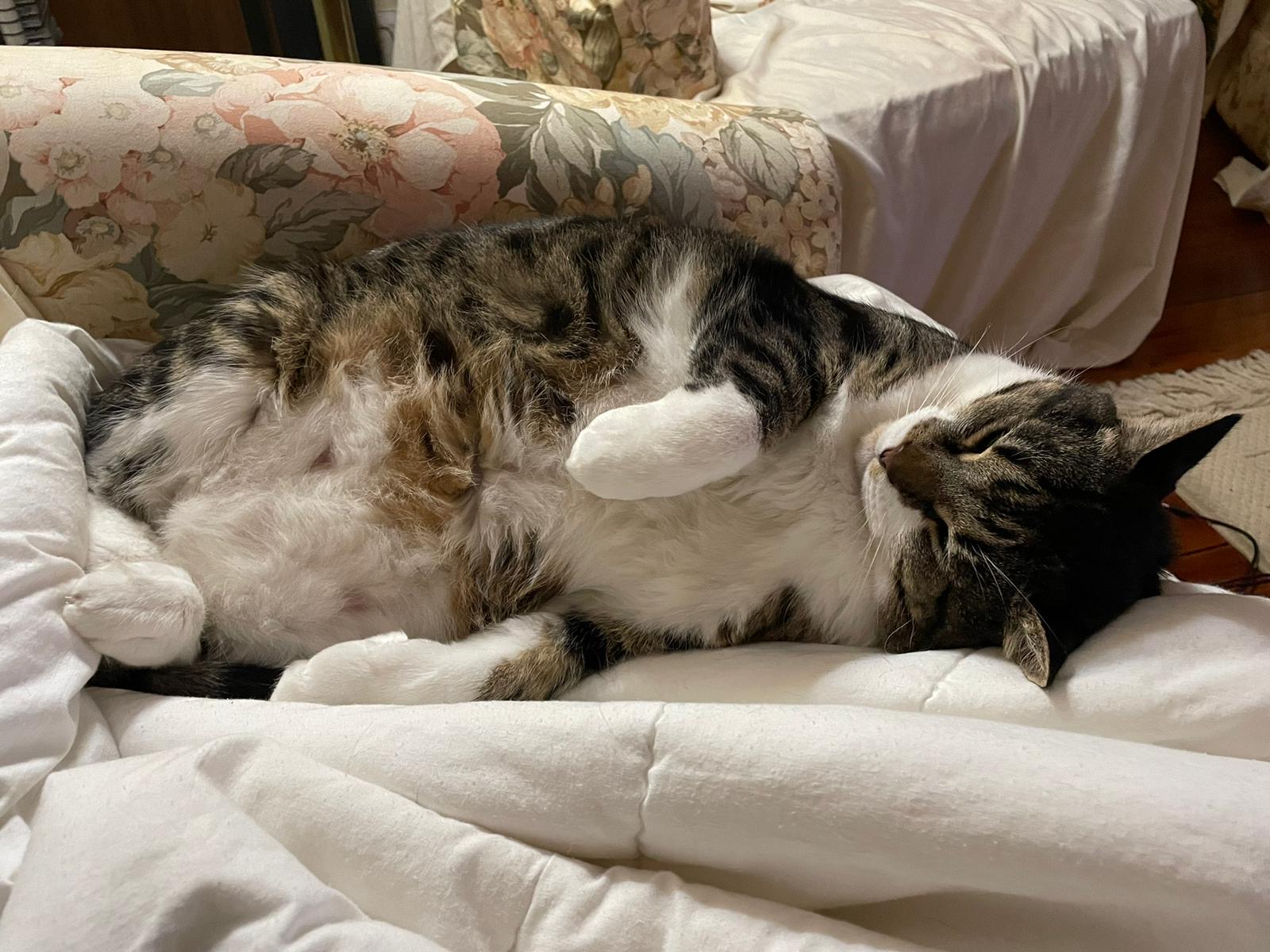 Jake enjoys a simple, cozy routine: a friendly morning chat to remind you it’s breakfast time, a wander outside to enjoy fresh air and sunshine, and long naps in warm, soft spots. He’s playful in the sweetest way — just wait until you see him go after a scrunched-up foil ball!