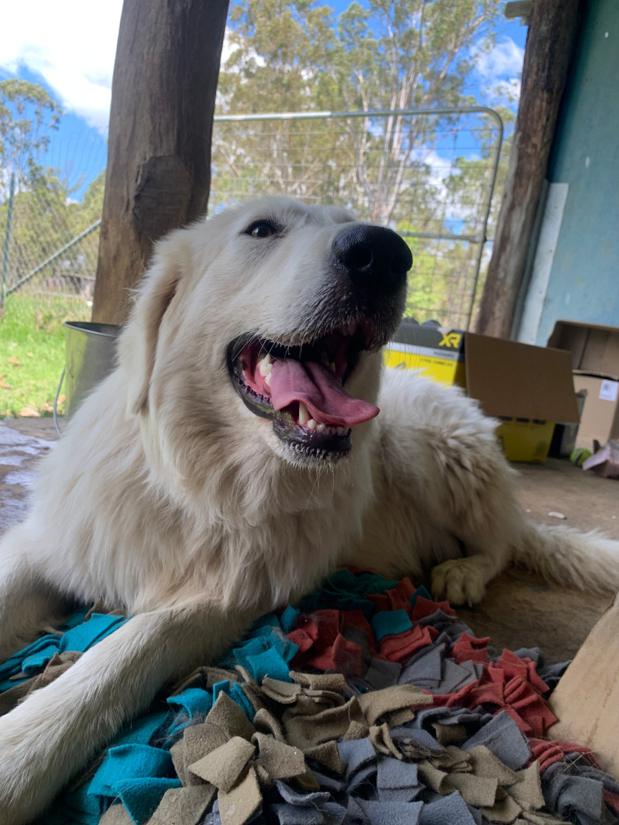 She would be fine as part of a family with older kids although being a Maremma she does bark to alert to novel things and would do best living outside of town. She has never worked as a guardian but would likely do well with the right introduction and training, however she does enjoy the company of people so being solo without social time probably isn't her thing. She would love to go with one of her siblings, mum or another dog if possible.