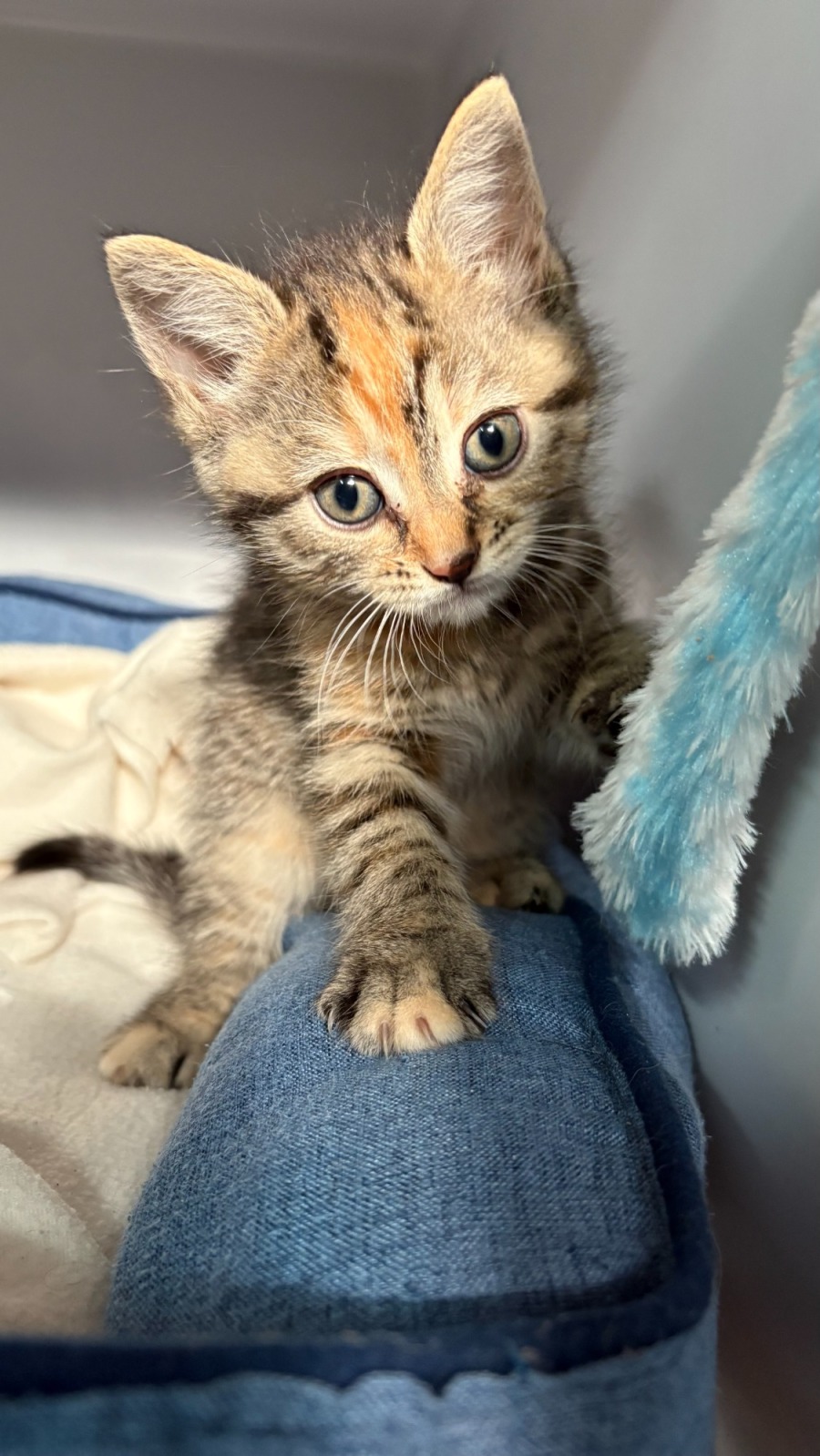 Meet Saffron, an adorable kitten who's approximately 5 weeks old and looking for a loving new family to call her own. Arriving alongside her two sisters, Saffron's sweet personality sets her apart. Her initial shyness around new people is quickly overcome by her playful nature, making her a charming little bundle of joy.