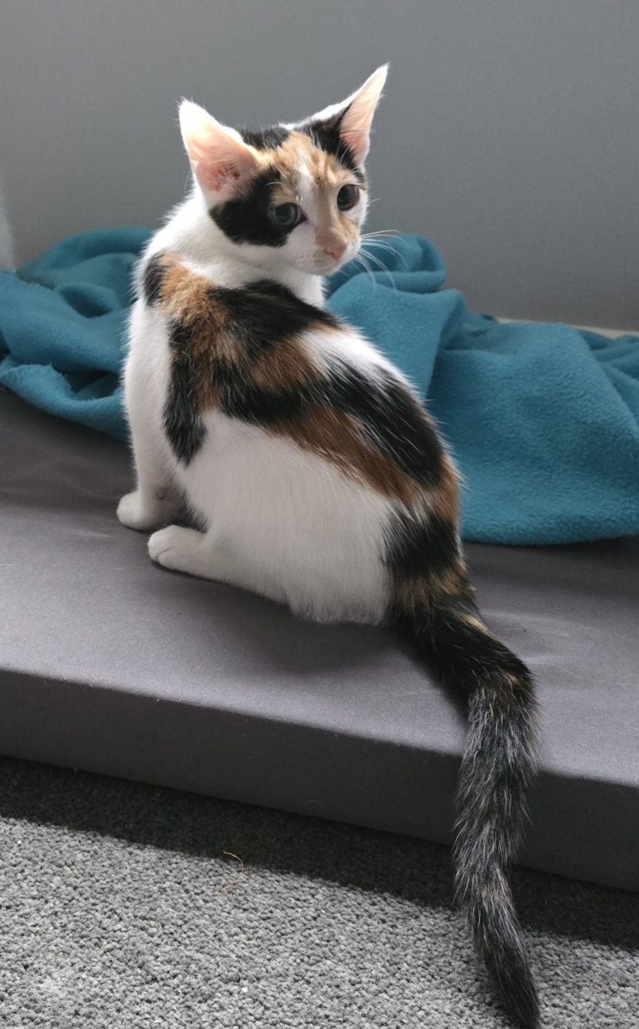 Meet Sabre, a dazzling calico beauty with an effervescent spirit and a personality that lights up the room. With her vibrant coat and playful antics, she's sure to capture your heart at first glance. As a kitten, Sabre blossomed from a little one hesitant to leave her mother's side into a confident and spirited party girl, always ready for fun!