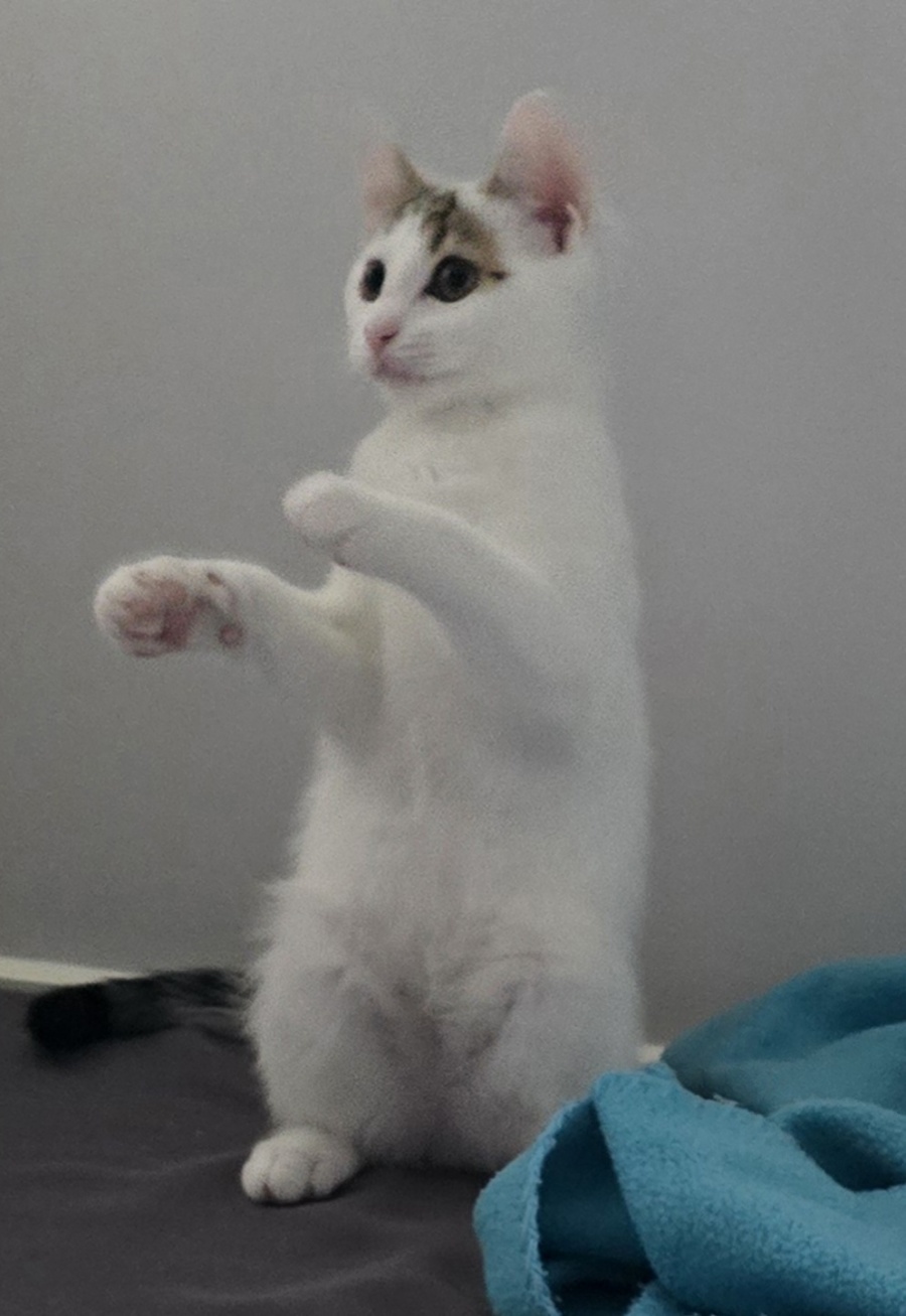 Meet Naz, a charming feline who embodies a delightful blend of playfulness and sweetness. With his captivating white coat accented by handsome tabby markings on his head and tail, Naz is a strikingly handsome companion searching for his new family. Always up for an adventure, Naz's playful antics, often shared with his sister Sabre, are bound to bring laughter and joy to any household.